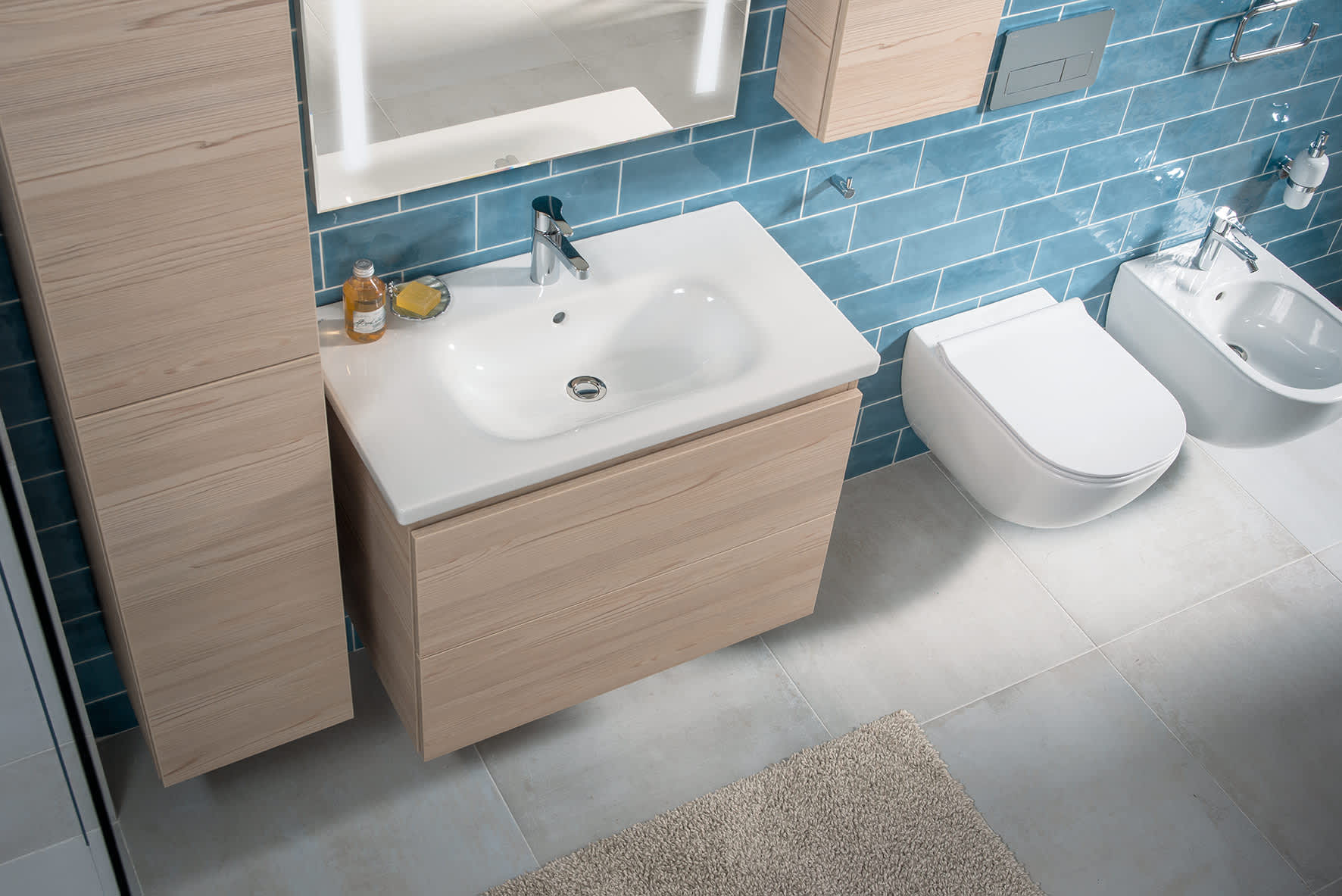 The wide range of products from the Mio-N bathroom series allows for great variability. The combination of pleasant elegance and practicality is brought by the vanity unit and washbasin from this series. Their graceful design corresponds to the Mio Rimless wall-hung toilet and also provides sufficient a storage surface. The advantage of Mio-N furniture is a simple timeless design enhanced by the absence of handles.